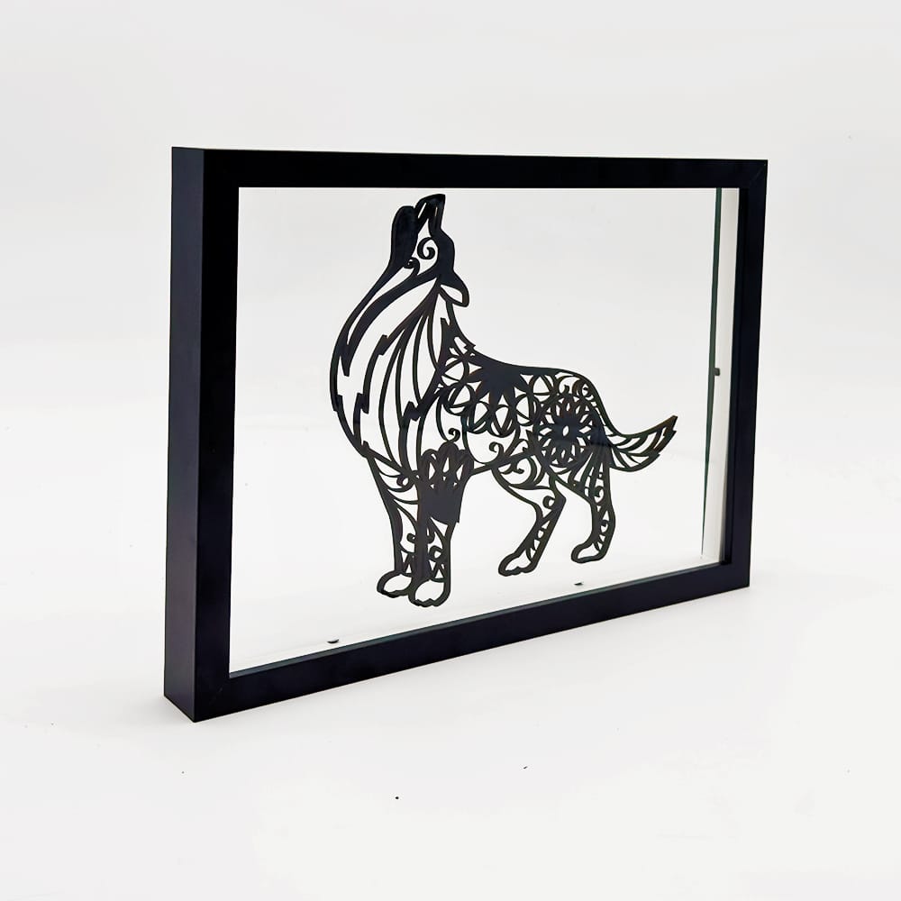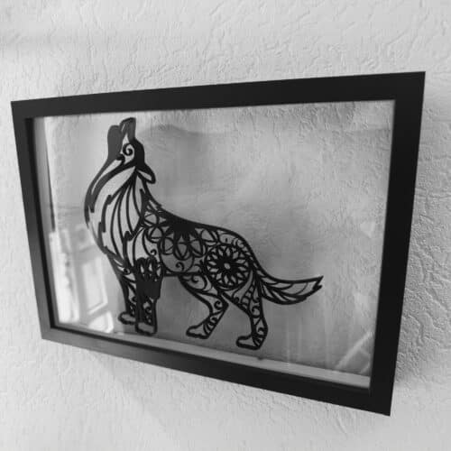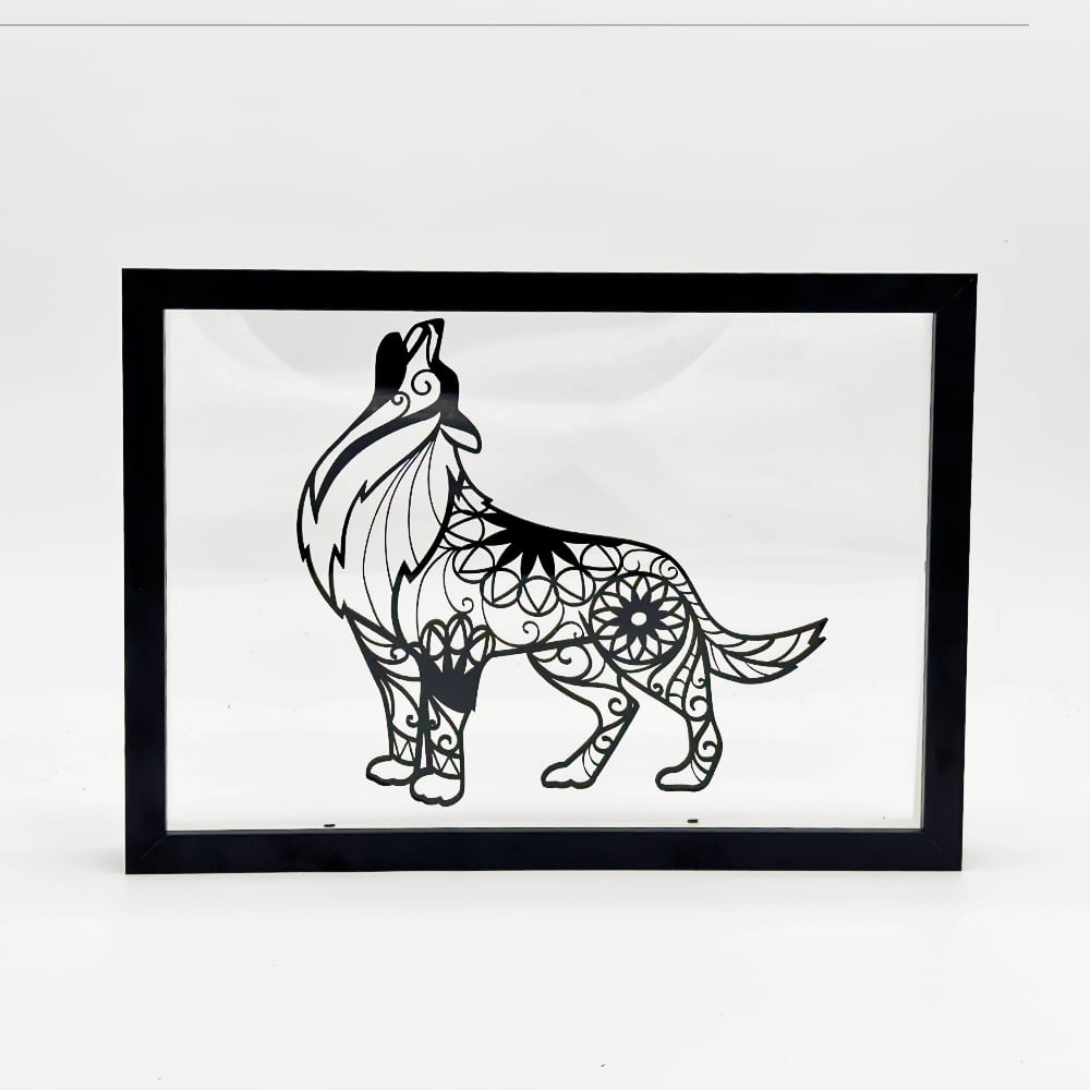 Das Kunstwerk WoodArt Howling Wolf ist eine exquisite Darstellung eines heulenden Wolfes, kombiniert mit kunstvollen Mandala-Elementen. Der Schattenschnitt besteht aus 4mm starkem Pappelholz und ist mit einem seidenglänzenden Finish veredelt, das dem Stück eine edle und zeitlose Ästhetik verleiht. Diese detailreiche Darstellung des Wolfes und der Mandala-Elemente ist in einem hochwertigen Bilderrahmen von 40x30x3cm untergebracht.