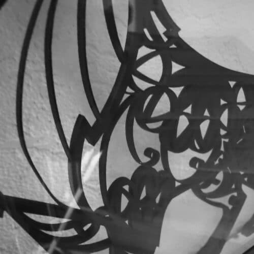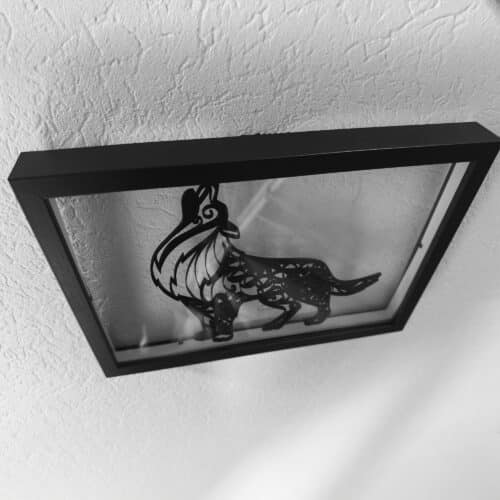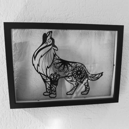 Der Bilderrahmen selbst besticht durch seine Schattenfuge, die dem Schattenschnitt eine schwebende Wirkung verleiht. Dieser faszinierende Effekt wird zusätzlich durch eine 4mm starke Acrylglasplatte auf der Vorder- und Rückseite verstärkt, die es ermöglicht, durch das Design hindurchzusehen und eine besondere Tiefenwirkung zu erzielen. Die Kombination aus Holz und Acrylglas in diesem Rahmen schafft ein harmonisches Zusammenspiel von Materialien und Licht, das den heulenden Wolf und die Mandala-Elemente auf einzigartige Weise zur Geltung bringt.