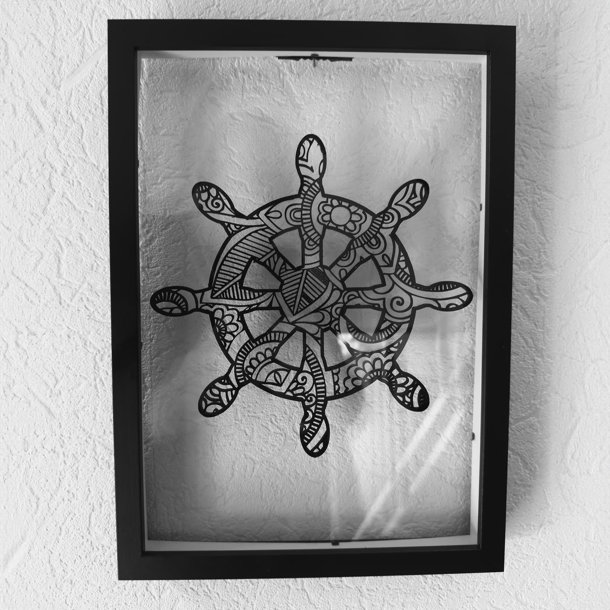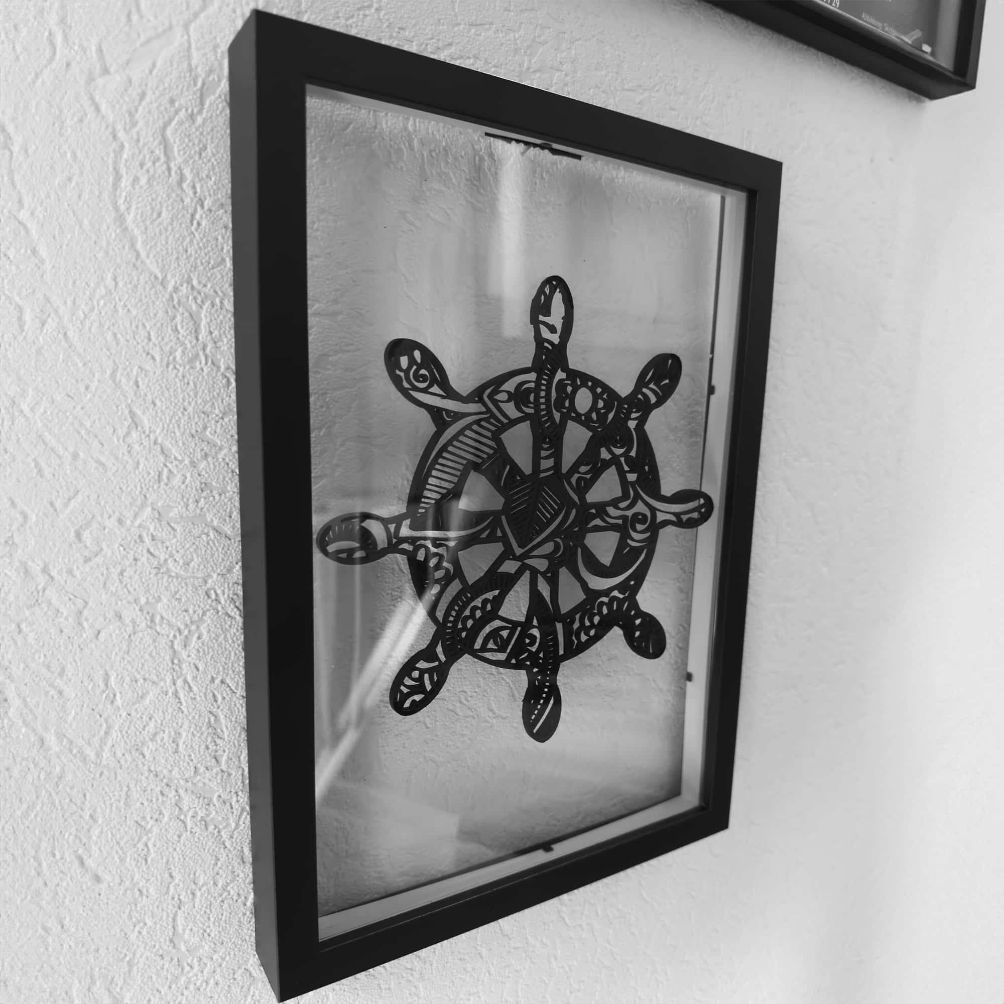 Der Bilderrahmen selbst besticht durch seine Schattenfuge, die dem Schattenschnitt eine schwebende Wirkung verleiht. Dieser faszinierende Effekt wird zusätzlich durch eine 4mm starke Acrylglasplatte auf der Vorderseite und Rückseitge verstärkt, die es ermöglicht, durch das Design hindurchzusehen und eine besondere Tiefenwirkung zu erzielen. Die Kombination aus Holz und Acrylglas in diesem Rahmen schafft ein harmonisches Zusammenspiel von Materialien und Licht, das das Schiffsteuerrad auf einzigartige Weise zur Geltung bringt.